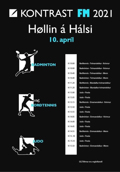 Her er vegleiðandi skrá fyri Kontrast FM finaludagin, sum verður komandi leygardag í Høllini á Hálsi. Kringvarp Føroya sjónvarpar frá finalunum seinnapart.
